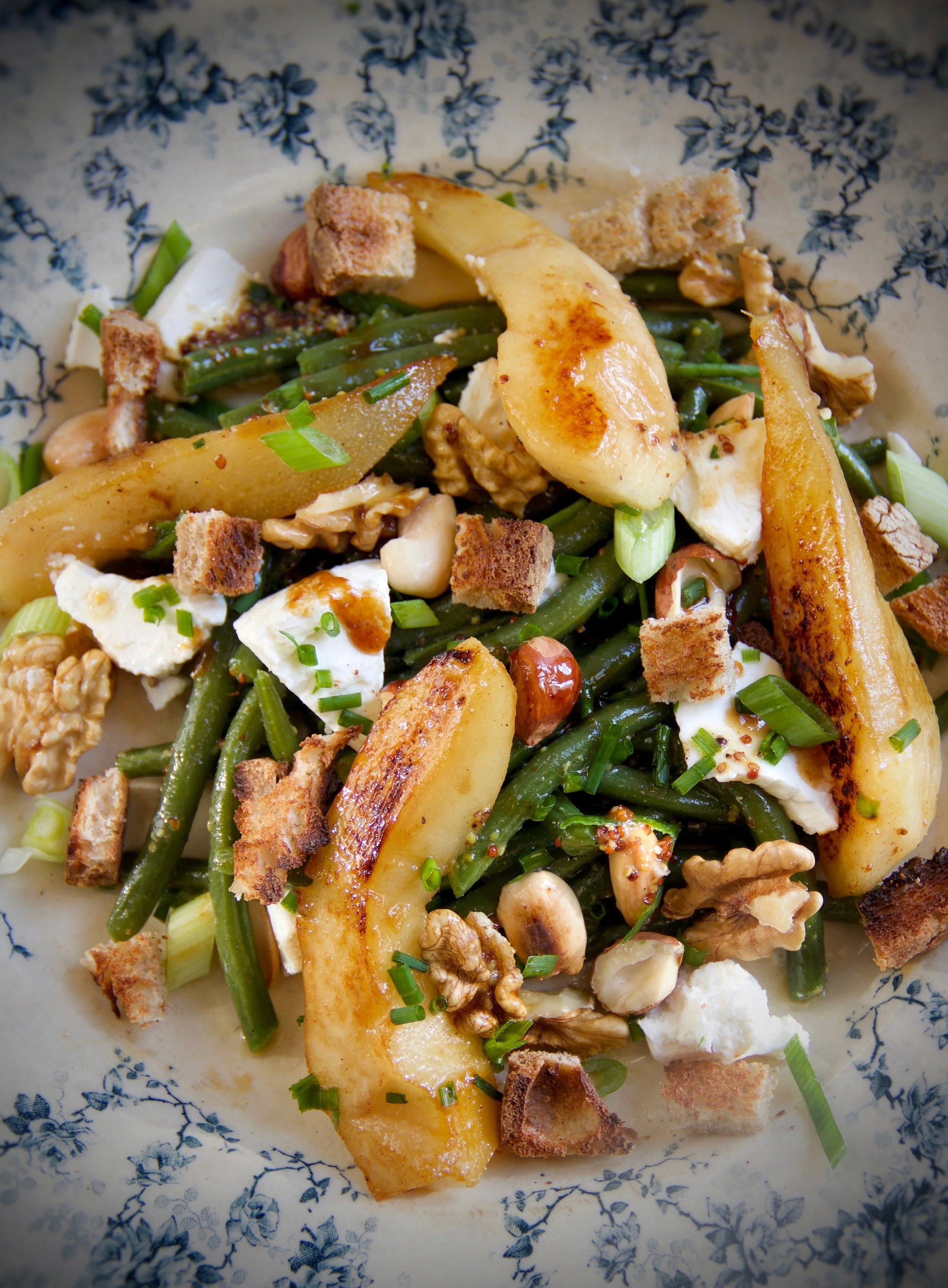 @christineandthechefs nous propose sa salade de haricots verts, poires, ciboulette, noisettes, noix, amandes torréfiées et chèvre frais